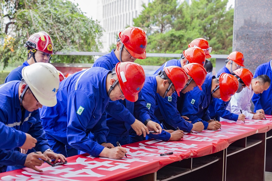 会上,公司和外协单位代表分别作表态发言。全员进行安全宣誓,并在主题横幅上郑重签名,以笔为诺践行安全誓言。