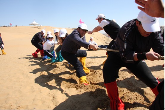 在响沙湾温暖的沙山上,活动组委会将所有参加活动的员工随机分成了四组,在四个小组间展开了别开生面、妙趣横生的趣味竞技活动。比赛中,各组队员团结一致,齐心协力,在充分体现团队精神的同时也将各项比赛的趣味性、娱乐性表现得淋漓尽致。